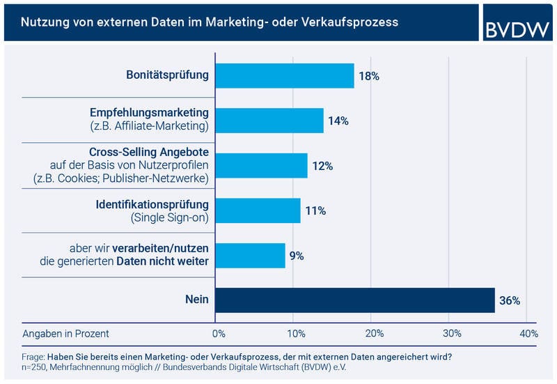 In der aktuellen Coronakrise setzen zahlreiche Unternehmen verstärkt auf den Digital Commerce. Um diesen möglichst erfolgreich umzusetzen, ist die richtige und effiziente Nutzung der Daten im Digital Commerce ausschlaggebend. Die heute veröffentlichte Studie des Bundesverbands Digitale Wirtschaft (BVDW) e.V. zum Thema Data Driven Commerce zeigt jedoch: 33 Prozent der 250 Befragten aus unterschiedlichen Branchen sind sich unsicher, wie sie interne und externe Daten einsetzen können. Mehr als ein Drittel (36 Prozent) der Befragten geben an, keinen auf externe Daten gestützten Marketing- oder Verkaufsprozess zu haben.