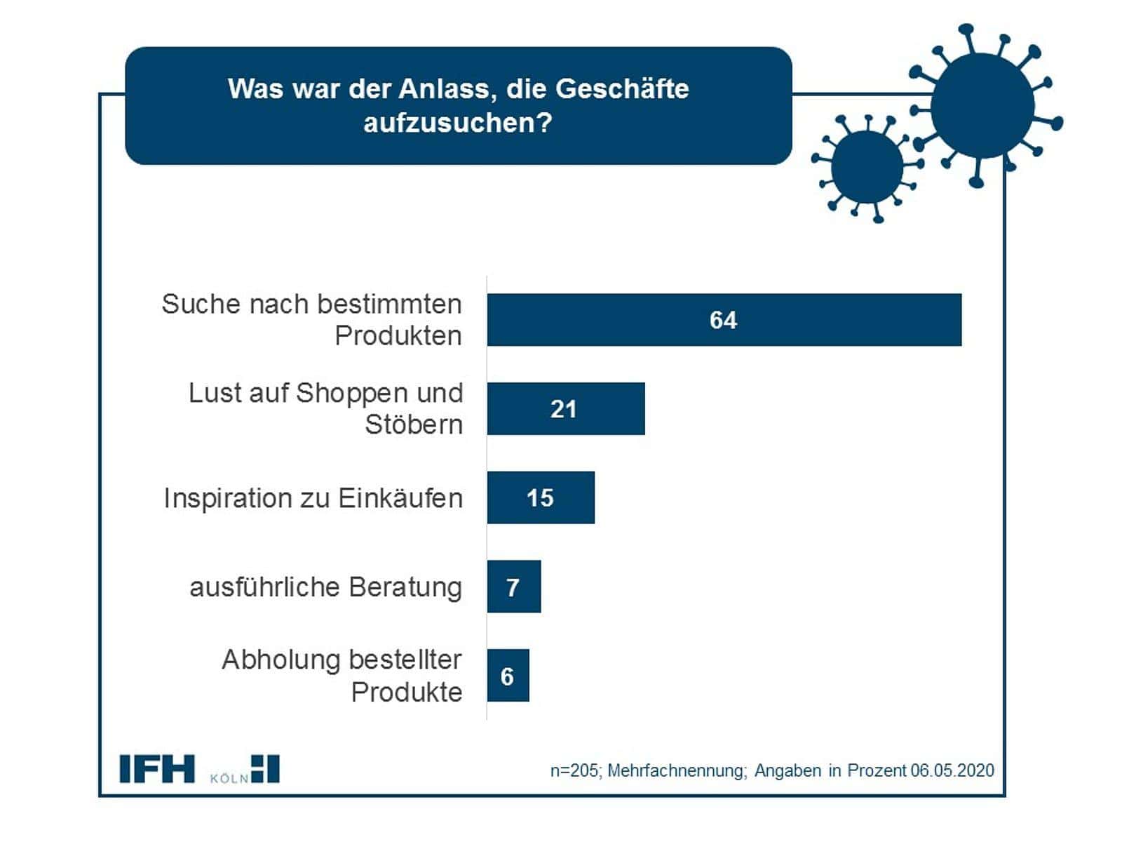 Nachdem Geschäfte des stationären Einzelhandels wochenlang geschlossen hatten, wird die Möglichkeit nun wieder vor Ort einkaufen zu können, noch kaum genutzt: 57 Prozent der Konsumentinnen und Konsumenten haben Geschäfte, die nun wieder geöffnet sind, noch gar nicht besucht. 35 Prozent geben an, stationäre Läden erst wenig besucht zu haben, und lediglich sechs Prozent der Befragten gehen bereits wieder regelmäßig im stationären Einzelhandel einkaufen.