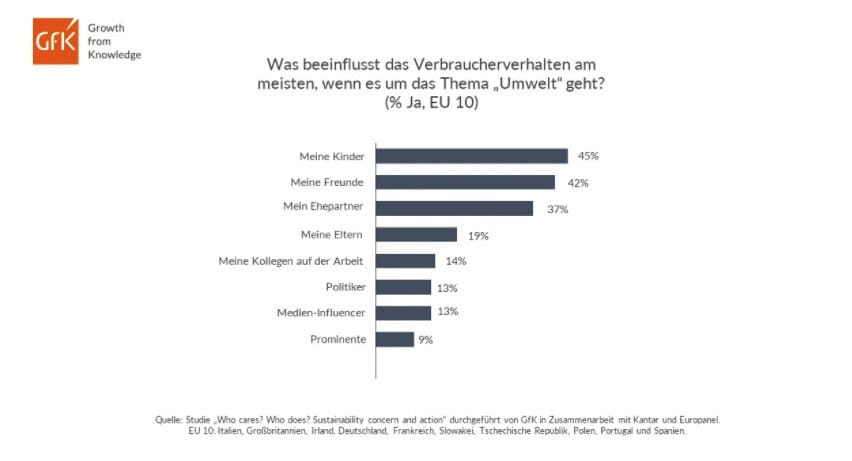 Im Jahr 2019, als diese Studie startete, war die Umwelt ein besonderes Anliegen der Jugend. Auf der ganzen Welt beteiligten sich Jugendliche an den „Fridays for Future“-Demonstrationen. 2020, als sich die Verbraucher im Lockdown befanden und der Gefahr einer globalen Pandemie ausgesetzt waren, schien es, als ob das Thema „Umwelt“ von der Tagesordnung verschwindet. Die GfK-Ergebnisse zeigen jedoch, dass dies in vielen Haushalten nicht der Fall ist, und das Thema Umwelt noch immer ein wichtiges Anliegen ist. Dabei haben die jüngeren Familienmitglieder den größten Einfluss auf die Einkaufstrends in der Familie. In den 10 untersuchten Ländern werden die Haushaltsverantwortlichen in ihrem Verhalten in erster Linie von ihren Kindern beeinflusst (45 Prozent), gefolgt von ihren Liebsten: von Freunden (42 Prozent), Ehepartnern (37 Prozent) und Eltern (19 Prozent). Trotz ihres jungen Alters sind Kinder überzeugender als Politiker (14 Prozent), Medien-Influencer (13 Prozent) oder Prominente (9 Prozent).