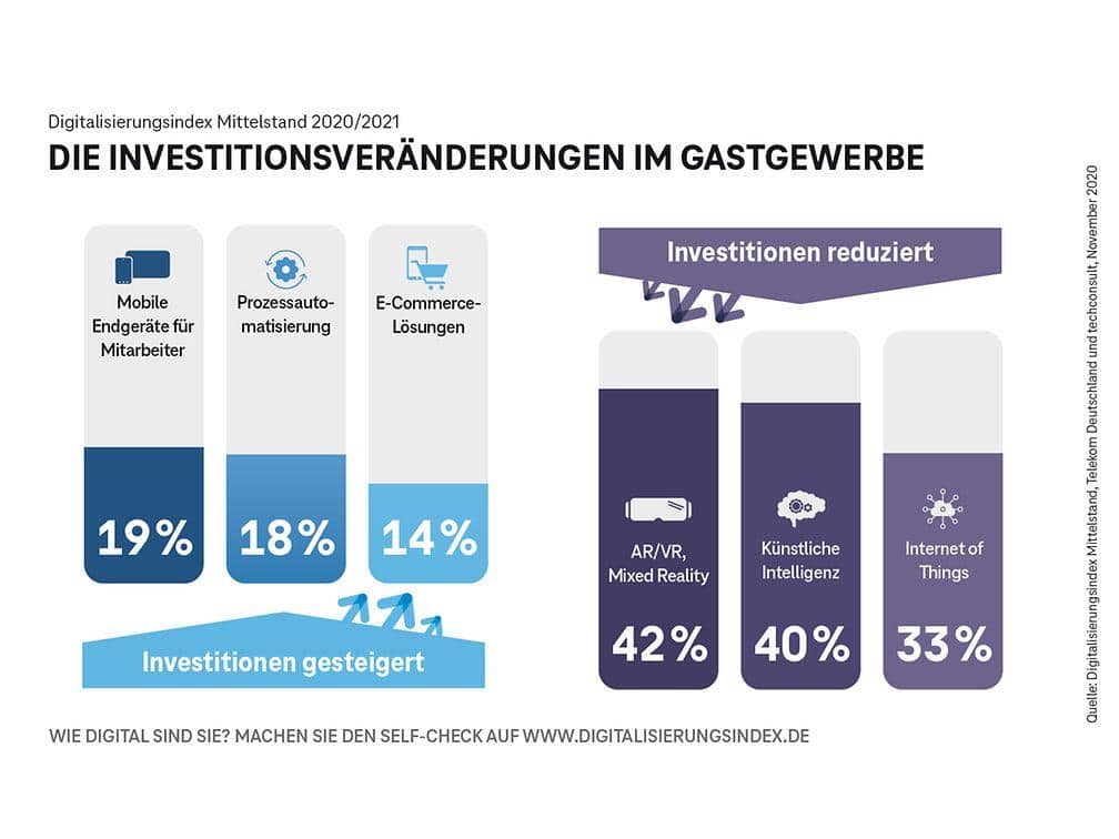Kaum eine andere Branche leidet mehr unter den Folgen der Corona-Pandemie als das Gastgewerbe. Um die massiven Umsatzeinbrüche abzumildern, nutzen die Betriebe verstärkt digitale Lösungen. Mit 57 von 100 möglichen Indexpunkten haben die Gastbetriebe den Digitalisierungsgrad gegenüber dem Vorjahr um drei Punkte gesteigert. Zu diesem Ergebnis kommt die Benchmark-Studie „Digitalisierungsindex Mittelstand 2020/2021“. Die Erhebung hat techconsult bereits zum fünften Mal im Auftrag der Deutschen Telekom durchgeführt.