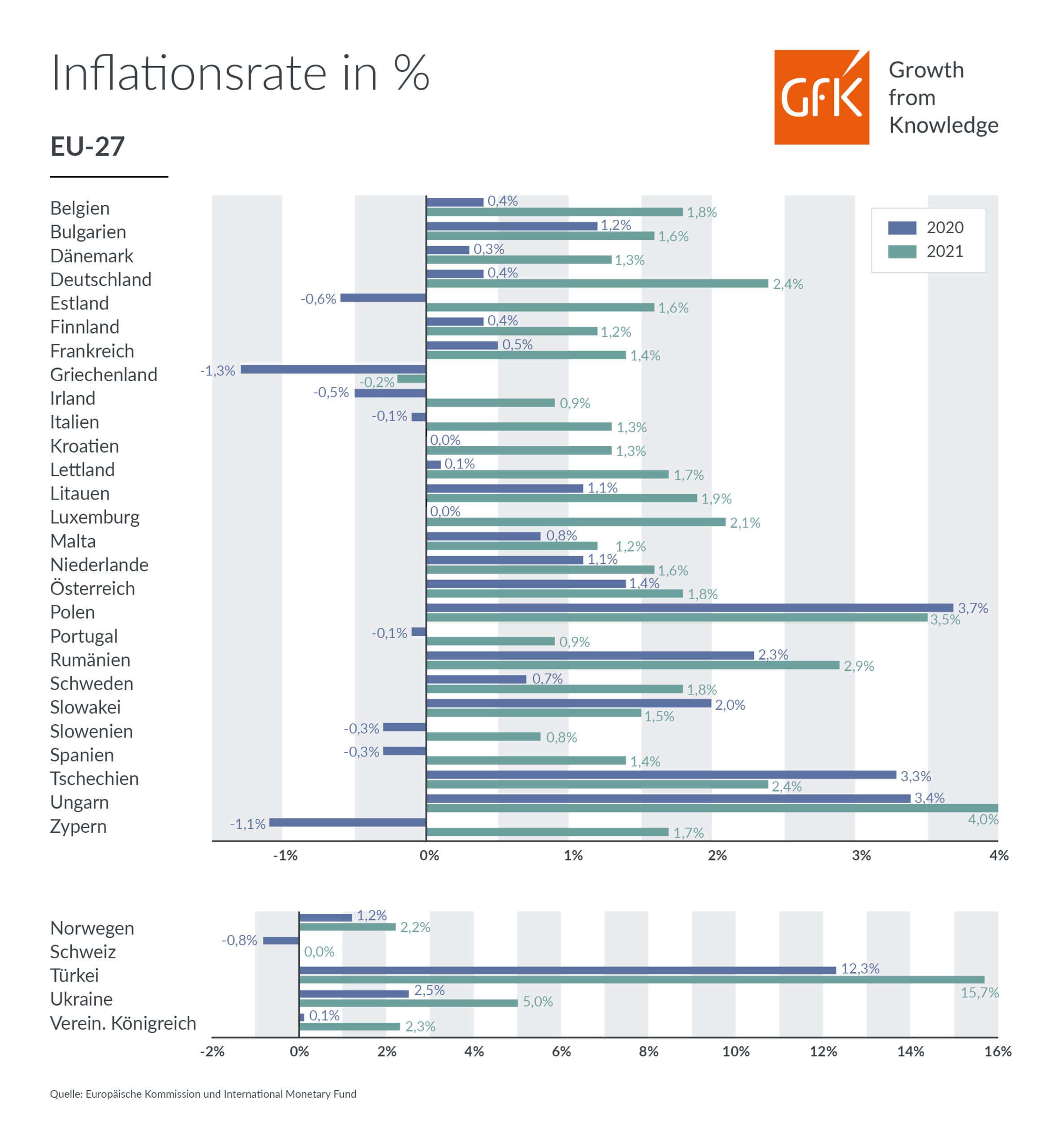 Kaufkraft: Unter den 27 EU-Staaten verzeichneten Spanien, Italien und Zypern die größten Einkommensrückgänge, da sich hier die langen Lockdowns und auch die Abhängigkeit der Wirtschaft vom Tourismus bemerkbar machten. Auch in Ungarn, wo es in den vorangegangenen Jahren deutliche Einkommenszuwächse gab, waren 2020 große Rückgänge zu verzeichnen, wobei hier die schwache Entwicklung des ungarischen Forint die Schlüsselrolle spielt.