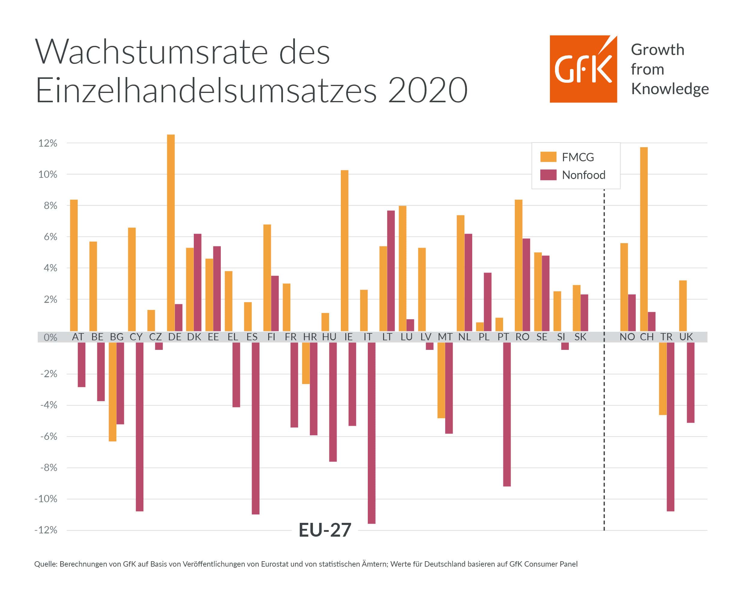Einzelhandelsumsatz: Der FMCG-Einzelhandel konnte 2020 in den EU-27-Staaten ein Umsatzwachstum von 5,5 Prozent verzeichnen. Dies ist unter anderem darauf zurückzuführen, dass der Nahrungsmittelkonsum aufgrund von geschlossenen Kantinen, Restaurants und allgemeinen Ausgangssperren in die eigenen vier Wände verlagert wurde. Die stärksten Zuwächse gab es in Deutschland (+12,4 Prozent), Irland (+10,3 Prozent), Österreich (+8,4 Prozent) und Luxemburg (+8,0 Prozent). Der Handel mit Gütern des nichttäglichen Bedarfs ging hingegen EU-weit um 3,0 Prozent zurück.