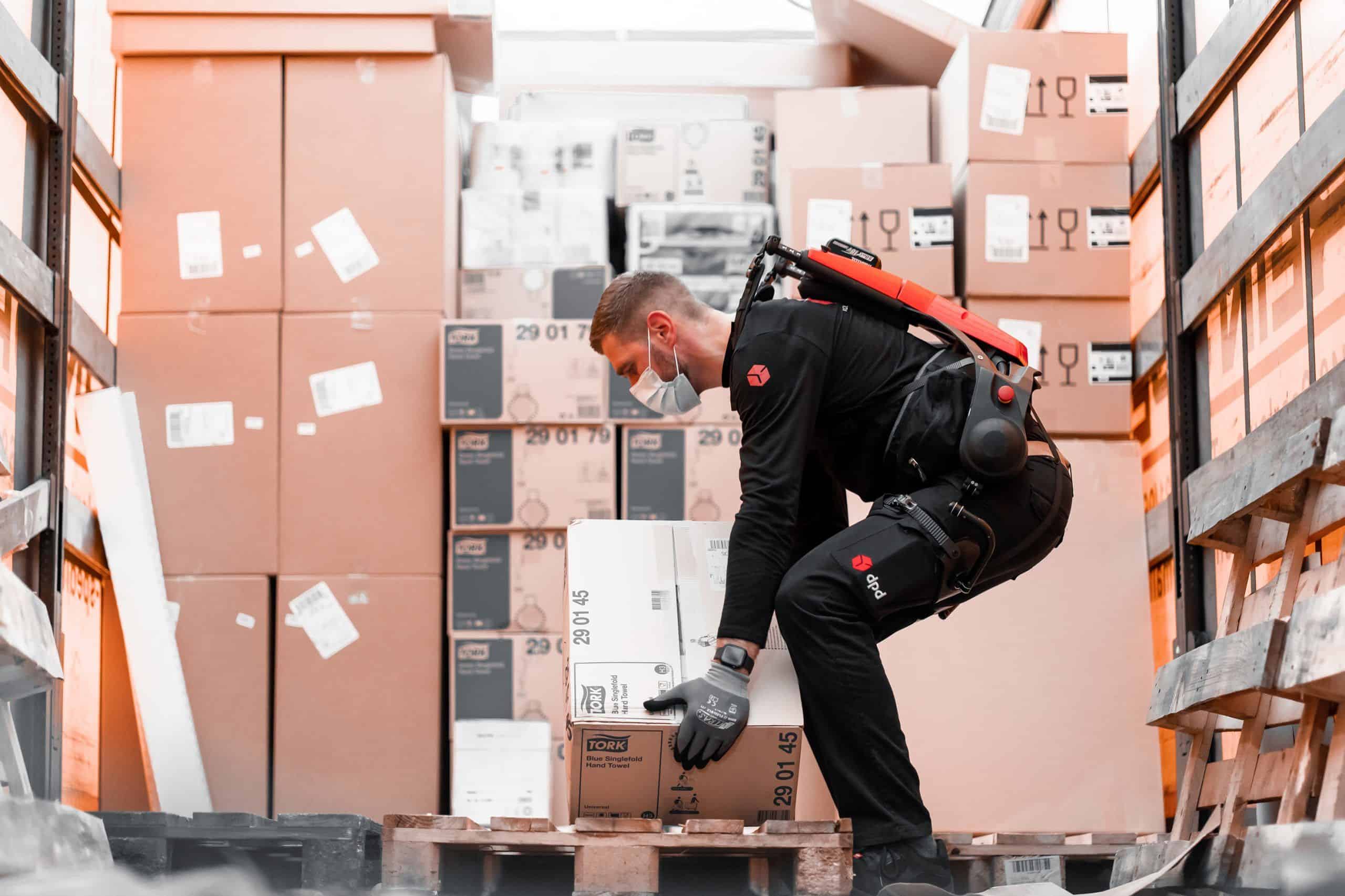 Bei einem Exoskelett handelt es sich um eine Stützvorrichtung, die je nach Bauweise unterschiedliche Bereiche des Körpers entlasten kann. Das Modell Cray X des Herstellers German Bionic schnallt sich der Träger, ähnlich wie einen Wanderrucksack, auf den Rücken und fixiert es anschließend am Körper. Nur kurz muss sich das Gerät mittels verbauter Sensorik kalibrieren und schon ist es einsatzbereit. Dabei wirkt das Cray X auf zweierlei Weise: Zum einen hält es den Rücken des Trägers stets gerade. Zum anderen hilft das Gerät, den Rücken beim Aufheben eines Paketes wieder aufzurichten. Zwei von einer intelligenten Software gesteuerte Motoren ziehen den Träger hierzu an den Schultern nach oben, die Kraft wird unter anderem auf die Oberschenkel umgeleitet. So entsteht eine Rückenentlastung von bis zu 30 Kilogramm bei jeder Hebebewegung.