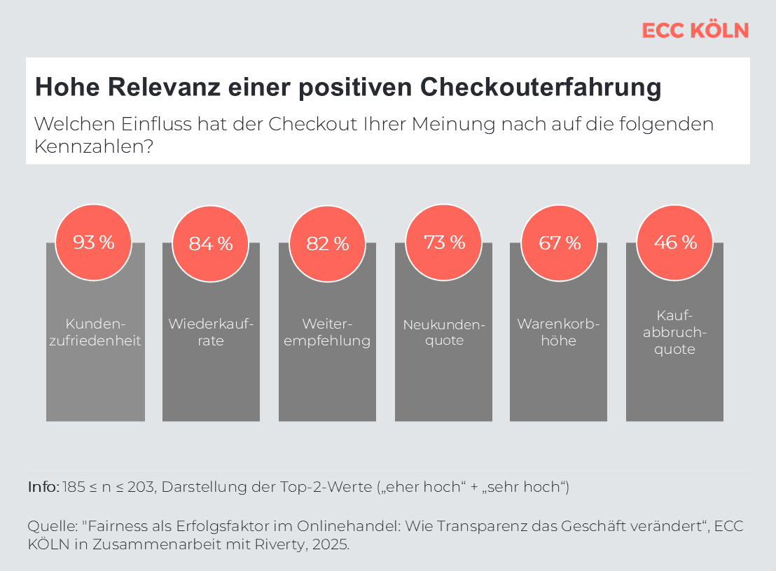 Ein reibungsloser, fairer und transparenter Checkout-Prozess trägt laut 93 Prozent der befragten Händler entscheidend zur Kundenzufriedenheit bei. Auch Wiederkäufe (84 Prozent) und die Neukundengewinnung (73 Prozent) werden positiv beeinflusst. Fast die Hälfte (46 Prozent) sieht zudem einen direkten Zusammenhang zwischen Checkout-Erlebnis und Kaufabbrüchen.