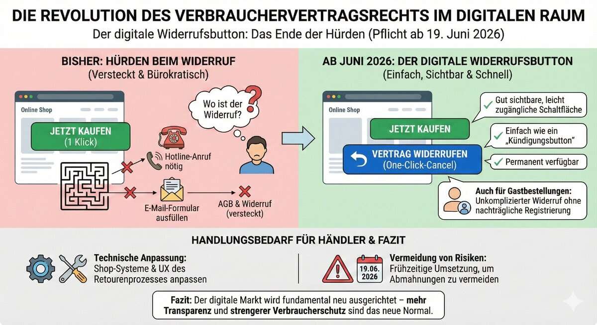 | 19. Juni 2026 | Pflicht zum Widerrufsbutton: Online-Shops müssen eine leicht zugängliche Schaltfläche für den Vertragswiderruf integrieren („One-Click-Cancel“). |