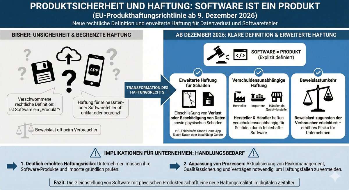Das Produkthaftungsrecht, das jahrzehntelang primär auf physische Defekte fokussiert war (z.B. explodierende Flaschen), wird 2026 an das digitale Zeitalter angepasst.