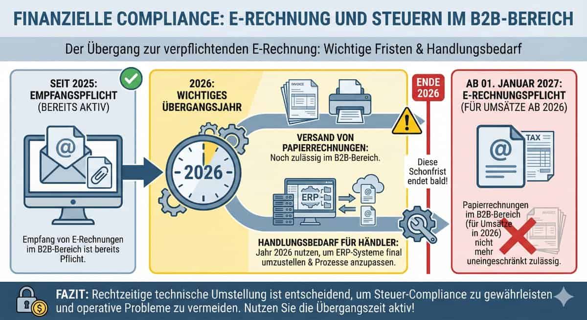 Händler sollten das Jahr 2026 jedoch nicht zum Ausruhen nutzen. Ab 2027 verschärfen sich die Regeln für große Unternehmen (>800.000 Euro Umsatz), und ab 2028 für alle. Die Umstellung der ERP-Systeme auf den automatisierten Versand strukturierter Datensätze sollte 2026 abgeschlossen werden, um Prozessbrüche zu vermeiden. Zudem müssen die Archivierungssysteme GoBD-konform für die neuen XML-basierten Formate ausgelegt sein.