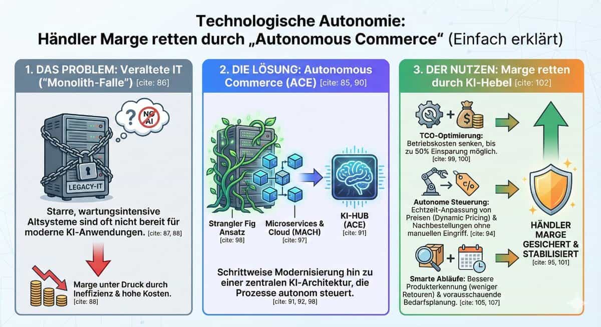 Während die Zollreform die Umsatzseite schützt, liegt der Schlüssel zur internen Rettung der Händler Marge in der Kostenstruktur. 2026 ist das Jahr, in dem Künstliche Intelligenz (KI) den Status des „Buzzwords“ verlässt und zur operativen Notwendigkeit wird. Es geht nicht mehr um singuläre Tools, sondern um eine fundamentale Architekturänderung hin zum Autonomous Commerce.