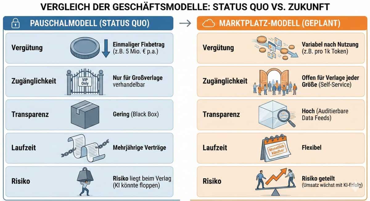 | Primäres Ziel | Strukturierte Lizenzierung und Monetarisierung redaktioneller Inhalte für KI-Entwickler . |