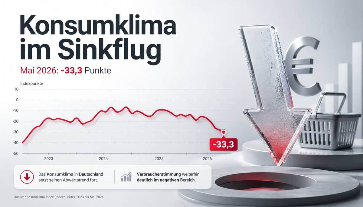 Das Konsumklima Deutschland fällt für Mai 2026 auf -33,3 Punkte. Besonders stark sinken die Einkommenserwartungen, während die Anschaffungsneigung ein Zwei-Jahres-Tief erreicht. Gleichzeitig treiben Energiepreise und Inflationserwartungen die Unsicherheit.