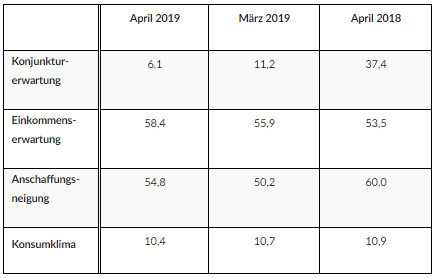 WeiterlesenDie Stimmung der Verbraucher zeigt im April 2019 insgesamt ein uneinheitliches Bild. Einkommenserwartung und Anschaffungsneigung legen
